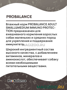 Влажный корм PROBALANCE ADULT SMALL&MEDIUM IMMUNO PROTECTION предназначен для ежедневного кормления взрослых собак маленьких и средних пород для укрепления и поддержания иммунитета.