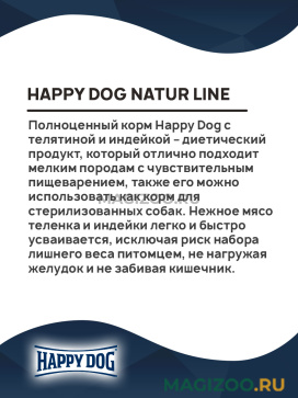 Полноценный корм Happy Dog с телятиной и индейкой – диетический продукт, который отлично подходит мелким породам с чувствительным пищеварением, также его можно использовать как корм для стерилизованных собак. Нежное мясо теленка и индейки легко и быстро усваивается, исключая риск набора лишнего веса питомцем, не нагружая желудок и не забивая кишечник.