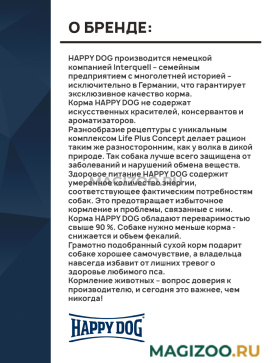 Информация о составе и ингредиентах, цветовом решении, технических и иных характеристиках, стране-изготовителе, внешнем виде и комплекте поставки товара носит справочный характер и основана на последних доступных к моменту публикации сведениях. Доставка данного товара осуществляется во все регионы РФ.Корма HAPPY DOG не содержат искусственных красителей, консервантов и ароматизаторов.