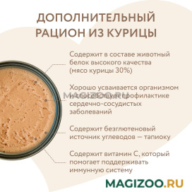 - «Мусс» из курицы с печенью рекомендуется использовать в качестве дополнительного источника питания к основному рациону Вашей собаки.