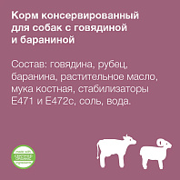 Полнорационный корм для взрослых собак с говядиной, рубцом и печенью.