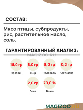 Мясо птицы, субпродукты, рис, растительное масло, соль.