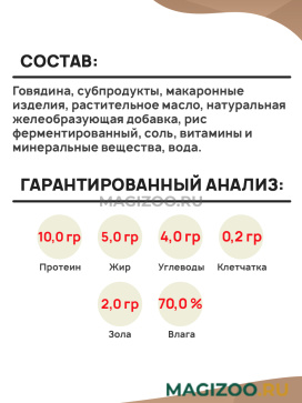 Говядина, субпродукты, макаронные изделия, растительное масло, натуральная желеобразующая добавка, рис ферментированный, соль, витамины и минеральные вещества, вода.