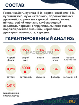 Говядина 28 %, курица 18 %, коричневый рис 18 %, куриный жир, мука из тапиоки, порошок пивных дрожжей, гидролизат куриной печени, тыква, яблоко, рыбий жир (жир глубоководной сардины), порошок спирулины, льняное масло, порошок ростков пшеницы, корневище дринарии, жимолость, куркума.