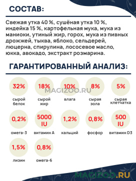 Полнорационный сбалансированный беззерновой корм супер-премиум класса с уткой и индейкой для взрослых собак. Рекомендован для взрослых собак с высоким уровнем активности.