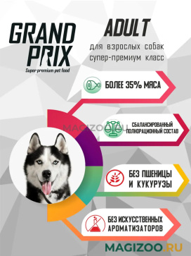 Корм Grand Prix Large Adult для взрослых собак крупных пород разработан, чтобы обеспечить Вашего питомца наилучшим сочетанием полезных веществ и микроэлементов.