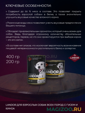 Торговая марка Landor выпускает сухие корма для собак всех породных и размерных категорий, а также ряд полнорационных влажных кормов для собак различных возрастных групп и лакомства для собак.