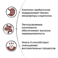 Входящий в состав пребиотик повышает эффективность полезных бактерий за счет стимуляции роста и развития кишечной микробиоты кошек.