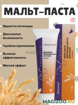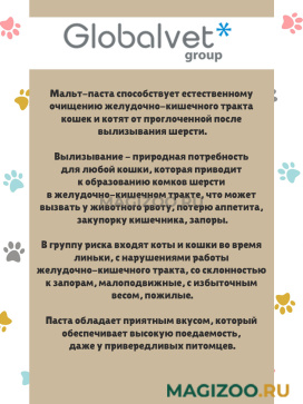 Мальт-паста способствует естественному очищению желудочно-кишечного тракта кошек и котят от проглоченной после вылизывания шерсти.