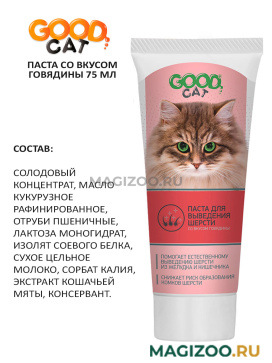 Паста Good Cat для кошек со вкусом говядины помогает естественному выведению шерсти из желудка и кишечника питомца.