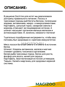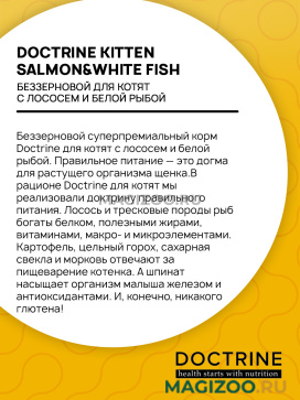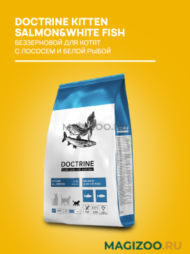 Беззерновой суперпремиальный корм Doctrine для котят с лососем и белой рыбой. Правильное питание — это догма для растущего организма щенка.