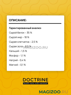 Информация о составе и ингредиентах, цветовом решении, технических и иных характеристиках, стране-изготовителе, внешнем виде и комплекте поставки товара носит справочный характер и основана на последних доступных к моменту публикации сведениях. Доставка данного товара осуществляется во все регионы РФ.С Doctrine Вы уверены в прекрасном самочувствии и крепком иммунитете питомца. При поддержке наших специалистов Вы гарантированно соблюдаете принципы правильного питания – сегодня, завтра и всегда!