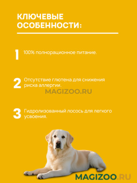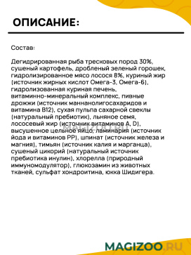 Дегидрированная рыба тресковых пород 30%, сушеный картофель, дробленый зеленый горошек, гидролизированное мясо лосося 8%, куриный жир (источник жирных кислот Омега-3, Омега-6), гидролизованная куриная печень, витаминно-минеральный комплекс, пивные дрожжи (источник маннанолигосахаридов и витамина В12), сухая пульпа сахарной свеклы (натуральный пребиотик), льняное семя, лососевый жир (источник витаминов А, D), высушенное цельное яйцо, ламинария (источник йода и витаминов РР), шпинат (источник железа и магния), тимьян (источник калия и марганца), сушеный цикорий (натуральный источник пребиотика инулин), хлорелла (природный иммуномодулятор), глюкозамин из животных тканей, сульфат хондроитина, юкка Шидигера.