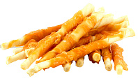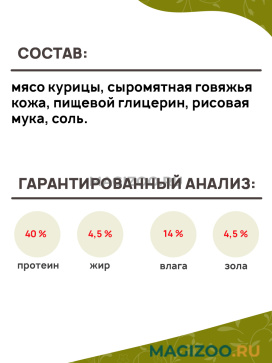Состав: мясо курицы, сыромятная говяжья кожа, пищевой глицерин, рисовая мука, соль.