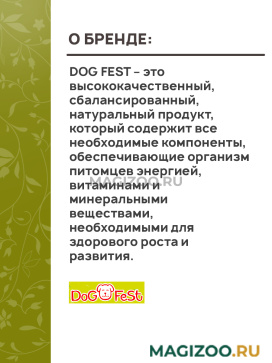DOG FEST – это высококачественный, сбалансированный, натуральный продукт, который содержит все необходимые компоненты, обеспечивающие организм питомцев энергией, витаминами и минеральными веществами, необходимыми для здорового роста и развития.