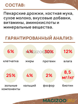 Пекарские дрожжи, костная мука, сухое молоко, вкусовые добавки, витамины, аминокислоты и минеральные вещества.