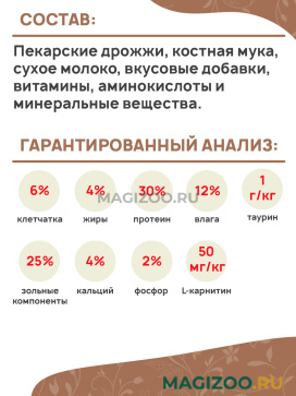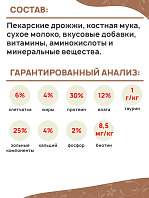 Пекарские дрожжи, костная мука, сухое молоко, вкусовые добавки, витамины, аминокислоты и минеральные вещества.