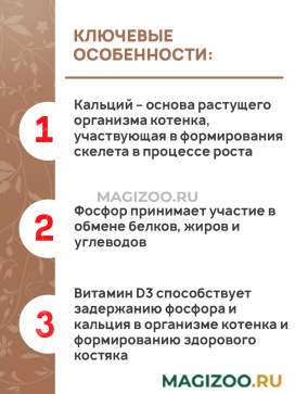 Уникальная формула для котят содержит все главные микроэлементы, витамины группы В и витамин D3, которые способствуют хорошей работе всех внутренних органов, правильному обмен веществ и укреплению иммунитета.