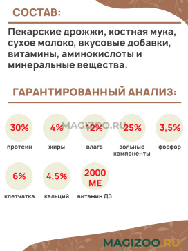 Пекарские дрожжи, костная мука, сухое молоко, вкусовые добавки, витамины, аминокислоты и минеральные вещества.