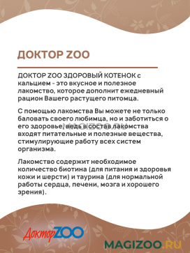 ДОКТОР ZOO ЗДОРОВЫЙ КОТЕНОК с кальцием - это вкусное и полезное лакомство, которое дополнит ежедневный рацион Вашего растущего питомца.