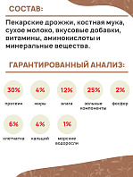 Пекарские дрожжи, костная мука, сухое молоко, вкусовые добавки, витамины, аминокислоты и минеральные вещества.