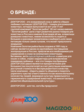 Информация о составе и ингредиентах, цветовом решении, технических и иных характеристиках, стране-изготовителе, внешнем виде и комплекте поставки товара носит справочный характер и основана на последних доступных к моменту публикации сведениях. Доставка данного товара осуществляется во все регионы РФ.ДОКТОР ZOO - товары для домашних животных, которые выпускаются вот уже 17 лет