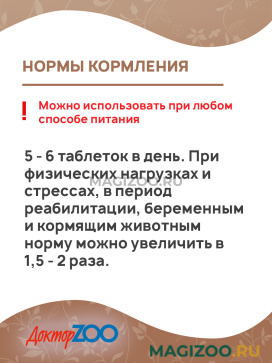 Способ применения: 5 - 6 таблеток в день. При физических нагрузках и стрессах, в период реабилитации, беременным и кормящим животным норму можно увеличить в 1,5 - 2 раза.