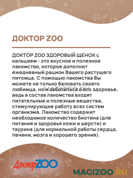 ДОКТОР ZOO ЗДОРОВЫЙ ЩЕНОК с кальцием - это вкусное и полезное лакомство, которое дополнит ежедневный рацион Вашего растущего питомца.
