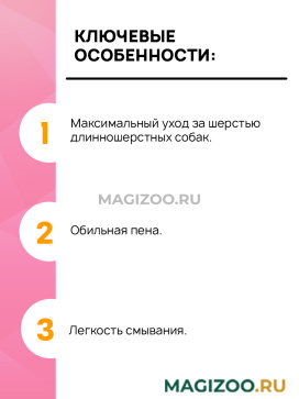 Шампунь обладает отличными моющими свойствами, образует обильную стойкую пену в воде любой жесткости, легко смывается. Придает объем, усиливает природный окрас и блеск шерсти.