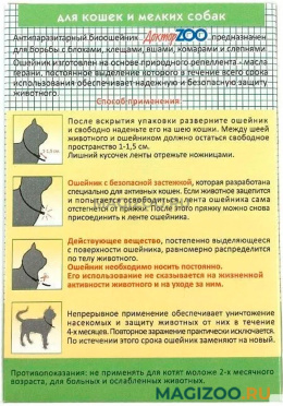 Ошейник изготовлен на основе природного репеллента – масла герани, постоянное выделение которого в течение всего срока использования обеспечивает надежную и безопасную защиту животного.