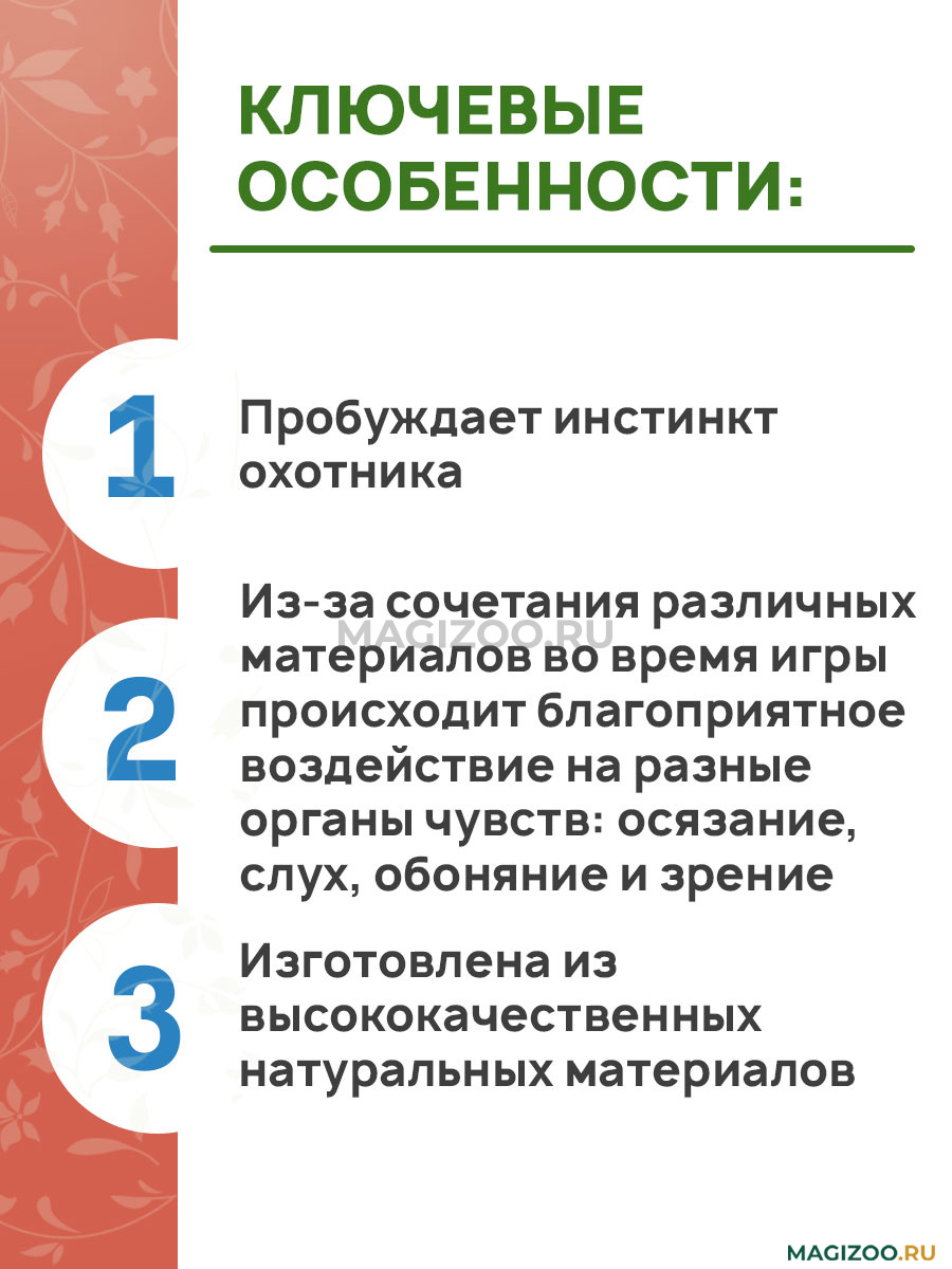 Дразнилка пробуждает инстинкт охотника в питомце, способствует балансировке его нервной системы благодаря выбросу лишней энергии, повышению мышечного тонуса и правильному развитию скелета благодаря физическим нагрузкам в процессе игры.