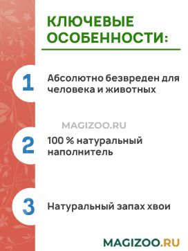 Является экологически чистым продуктом из 100 % натурального сырья. Эффективно поглощает запахи, экономичен в использовании, имеет приятный аромат хвои.