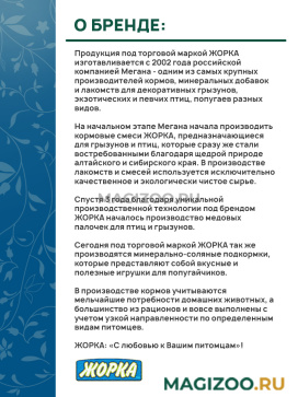 Информация о составе и ингредиентах, цветовом решении, технических и иных характеристиках, стране-изготовителе, внешнем виде и комплекте поставки товара носит справочный характер и основана на последних доступных к моменту публикации сведениях. Доставка данного товара осуществляется во все регионы РФ.На начальном этапе Мегана начала производить кормовые смеси ЖОРКА, предназначающиеся для грызунов и птиц, которые сразу же стали востребованными благодаря щедрой природе алтайского и сибирского края. В производстве лакомств и смесей используется исключительно качественное и экологически чистое сырье.