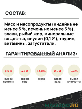 Мясо и мясопродукты (индейка не менее 5 %, печень не менее 5 %), злаки, рыбий жир, минеральные вещества, инулин (0,1 %), таурин, витамины, загустители.