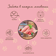 Полнорационный влажный корм для взрослых кошек всех пород с нежными кусочками из мяса курицы и утки.