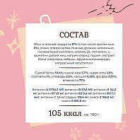Мясо и мясопродукты, рыба и продукты переработки рыбы (форель не менее 5 %, лосось не менее 5 %), злаки, рыбий жир, минеральные вещества, инулин (0,1 %), таурин, витамины, загустители.