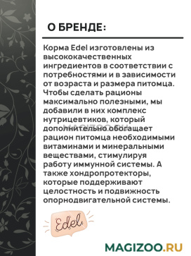 Корма Edel — это не просто питание для домашних животных, это забота, выраженная в каждом кусочке. Они созданы с проникновенной любовью к питомцам, будто это наши собственные дети.