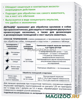 Животных короткошерстных пород опрыскивают водной эмульсией Дельцида, длинношерстных - купают в водной эмульсии препарата. Препарат растворяют в прохладной водопроводной воде в следующих концентрациях: Обработка животных опрыскиванием или купанием: Иксодовые и чесоточные клещи ( в т. ч. демодекс), вши, блохи, власоеды, мухи, слепни, гнус - 1 доза на 1,6 л воды с профилактической целью – однократно. С лечебной – 2-х, 3-х кратно с интервалом в 7 - 10 дней. Обрабатывают пораженные участки, с захватом по периметру очага 1 - 2 см здоровой кожи. Интервал 7 дней до получения 2-х отрицательных заключений исследования соскобов.