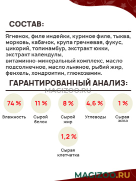 Ягненок, филе индейки, куриное филе, тыква, морковь, кабачок, крупа гречневая, фукус, цикорий, топинамбур, экстракт юкки, экстракт календулы, витаминно-минеральный комплекс, масло подсолнечное, масло льняное, рыбий жир, фенхель, хондроитин, глюкозамин.