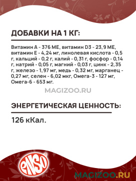- Поддерживает здоровье кожи и красоту шерсти, благодаря льняному маслу и рыбьему жиру в составе, которые являются источниками жирных кислот Омега 3 и Омега 6.