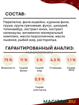 Перепелка, филе индейки, куриное филе, груша, крупа гречневая, фукус, цикорий, топинамбур, экстракт юкки, экстракт календулы, витаминно-минеральный комплекс, масло подсолнечное, масло льняное, рыбий жир, расторопша.