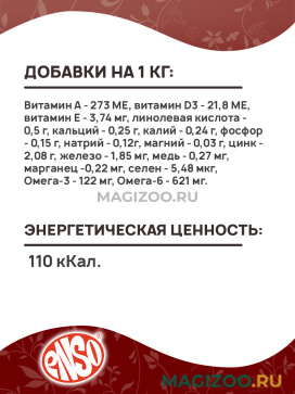 - Поддерживает здоровье кожи и красоту шерсти, благодаря льняному маслу и рыбьему жиру в составе, которые являются источниками жирных кислот Омега 3 и Омега 6.