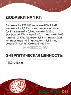 - Поддерживает здоровье кожи и красоту шерсти, благодаря льняному маслу и рыбьему жиру в составе, которые являются источниками жирных кислот Омега 3 и Омега 6.