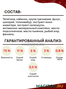 Телятина, кабачок, крупа гречневая, фукус, цикорий, топинамбур, экстракт юкки шидигера, экстракт календулы, витаминно-минеральный комплекс, масло подсолнечное, масло льняное, рыбий жир, фенхель.