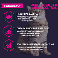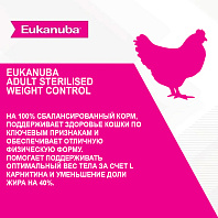 После стерилизации кошкам свойственно быстро набирать вес, поэтому профессиональный рацион Eukanuba для взрослых стерилизованных кошек и кошек с избыточным весом помогает поддерживать оптимальную кондицию за счёт L-карнитина, который способствует расщеплению жира в организме кошки. Доля жира в рационе уменьшена на 40 %, благодаря чему ваш питомец не наберёт лишний вес.