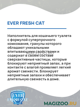 Наполнители ТМ Ever FreshCat® - элитная линейка высококачественных комкующихся наполнителей. Производится из специально обработанной и очищенной от пыли глины, в каждую гранулу которой помещен активированный уголь, который улавливает и блокирует неприятные запахи.