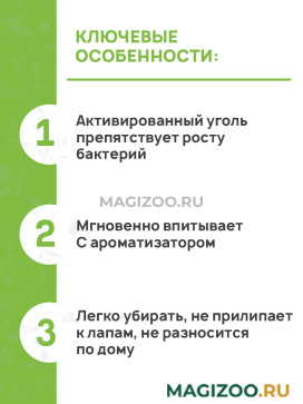 Небольшие по размеру гранулы имеют двойное действие-покрывают до 99% поверхности экскрементов и отлично впитывают жидкость. Высококачественная натуральная глина способствует образованию плотных комков, тем самым обеспечивает меньший расход наполнителя. Эффективно борется со всеми источниками неприятного запаха, тем самым поддерживает чистоту вашего дома, здоровье и благополучие вашего любимца.
