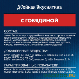 Состав: злаки, белок птицы и другие белки животного происхождения (включая говядину), продукты переработки растительного сырья, масла и жиры, экстракты растительного белка, глицерол, консерванты, минеральные вещества, дрожжи, сахара, аминокислоты, витамины, антиоксиданты.