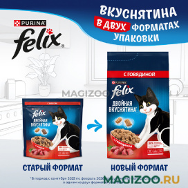 Феликс двойная вкуснятина с мясом - корм недорогой, хороший в своем сегменте. Его изюминка - это сочетание твердых и мягких гранул. У кусочков корма отличный размер, такой, что жевать их комфортно, и твердость оптимальная. По запаху неплохой корм. Моя кошка всегда после него сытая и ничего ее не беспокоит.