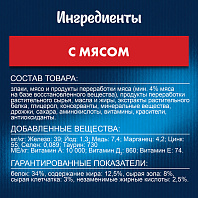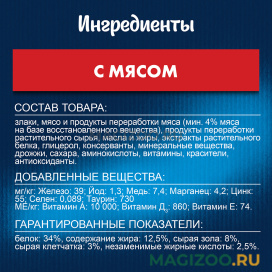 Состав товара:Злаки, мясо и продукты переработки мяса (мин. 4% мяса на базе восстановленного вещества), продукты переработки растительного сырья, масла и жиры, экстракты растительного белка, глицерол, консерванты, минеральные вещества, дрожжи, сахара, аминокислоты, витамины, красители, антиоксиданты.